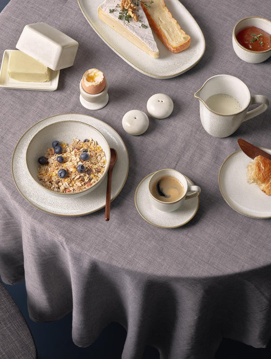 The "saisons" collection is handcrafted from stoneware in a small family business in Portugal. No less than three glazes - sand, denim & midnight blue - imitate the Portuguese coast and symbolize the sea, the sky and the beaches. Just as the ocean is sometimes more, sometimes less deep blue, the sand on the beach sometimes more, sometimes less fine and the sky sometimes more, sometimes less cloudy, so it is with the glazes of this collection. Each piece is truly unique. All three colors harmonize with each other or stand on their own. A variety of shapes for every occasion in a clear, reduced design language.