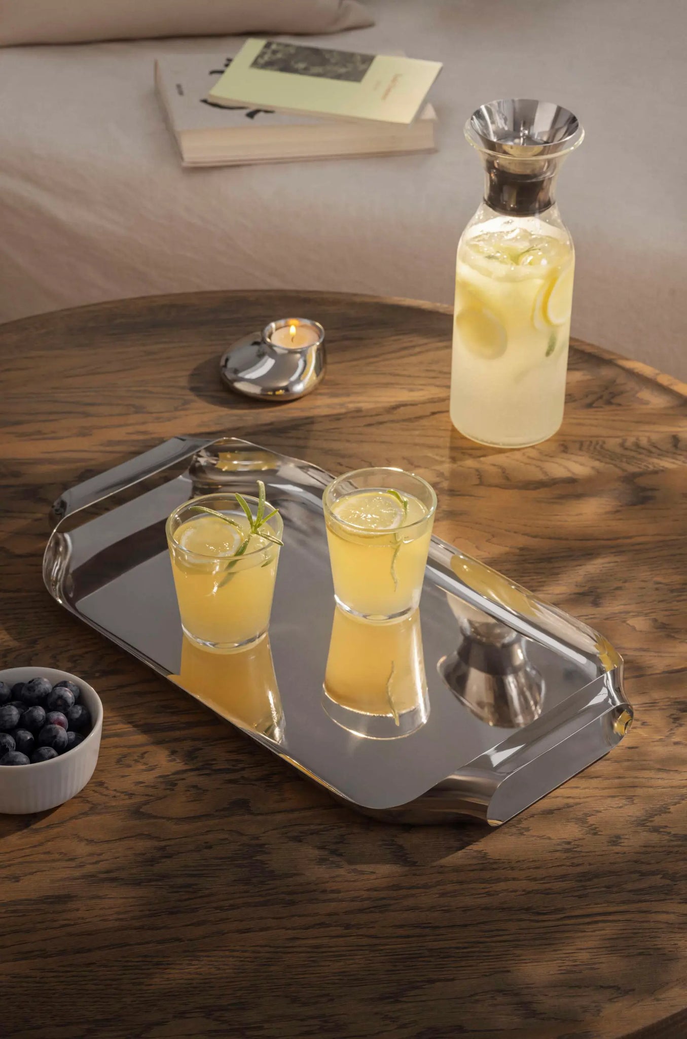 This elegant serving tray enhances the appeal of everything served, from breakfast in bed to chilled drinks on the patio. The clean, sleek lines are achieved by producing the tray from a single piece of steel with no unsightly welds. The deep-set handles enhance stability and balance even when the tray is fully laden. For added stability, a non-slip silicone tray mat is sold as an optional extra. With its compact, flat design, this tray stows easily in most kitchen drawers. Besides being practical for serving, the tray is also a decorative feature for your interiors – perfect for displaying ornaments, candlesticks and cut flowers. Dishwasher-safe.