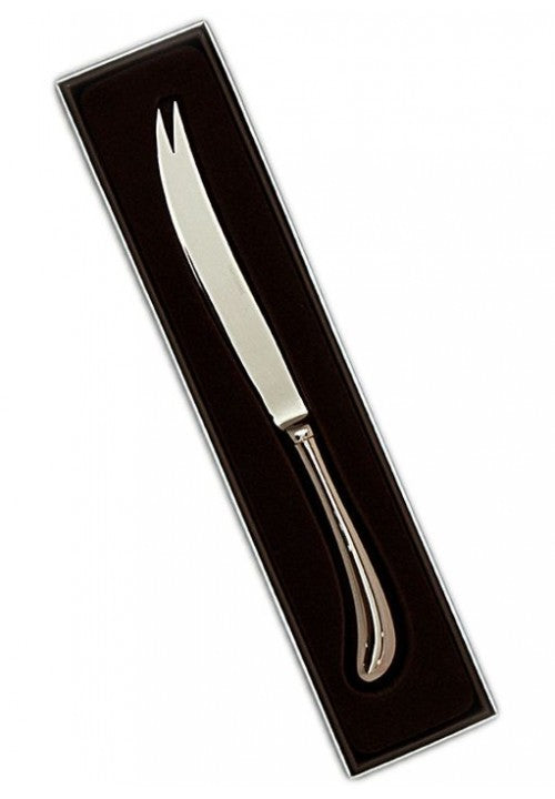 Sambonet cheese knives with a sinuous and classy design. The knife with split end is perfect for semi-hard or soft cheeses, where the curved blade prevents the cheese from sticking to it while cutting, while the ends allow to serve elegantly.